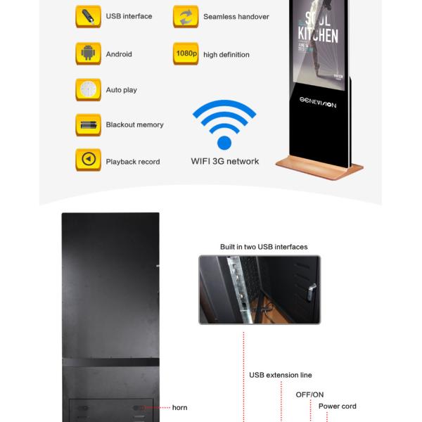 Genevision newly deveoped super thin advertising standee on hotsale, advertising can be updated by USB, or remote control software via WIFI/LAN, very easy to use. Most important, price is very good, MOQ of 1pc, ready in stock.